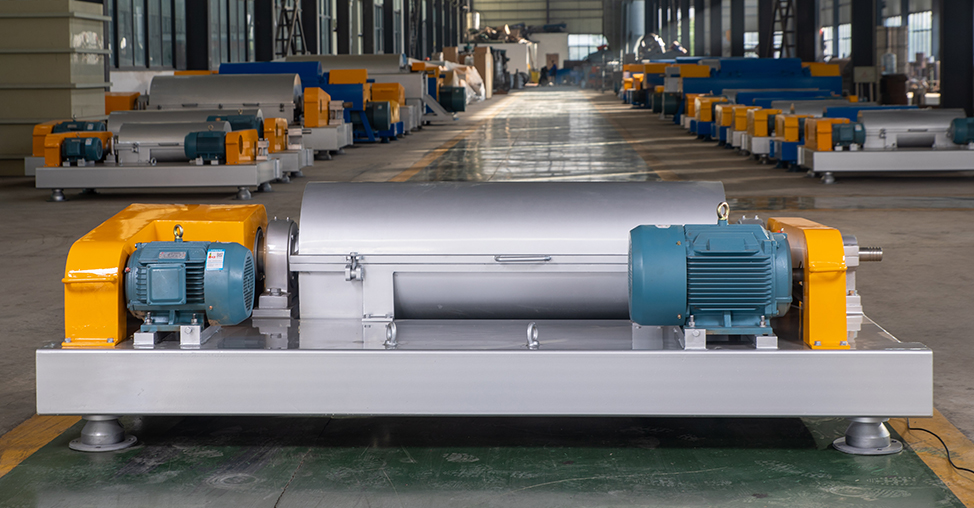 臥螺離心機(jī),又稱為臥式螺旋卸料沉降離心機(jī),利用高速旋轉(zhuǎn)產(chǎn)生的離心加速度將液體中的固體顆??焖俪两?,并沉積在轉(zhuǎn)鼓內(nèi)壁。物料通過(guò)進(jìn)料管被泵入腔體內(nèi)部后,轉(zhuǎn)鼓和螺旋輸送機(jī)以差速同向高速旋轉(zhuǎn),使固體沉淀在轉(zhuǎn)鼓內(nèi)壁上,然后通過(guò)螺旋輸送機(jī)排出,澄清的液相則從轉(zhuǎn)鼓另一端的出液堰口排出,從而實(shí)現(xiàn)對(duì)物料的連續(xù)進(jìn)料、分離和卸料的過(guò)程,最終達(dá)到固液分離的效果。