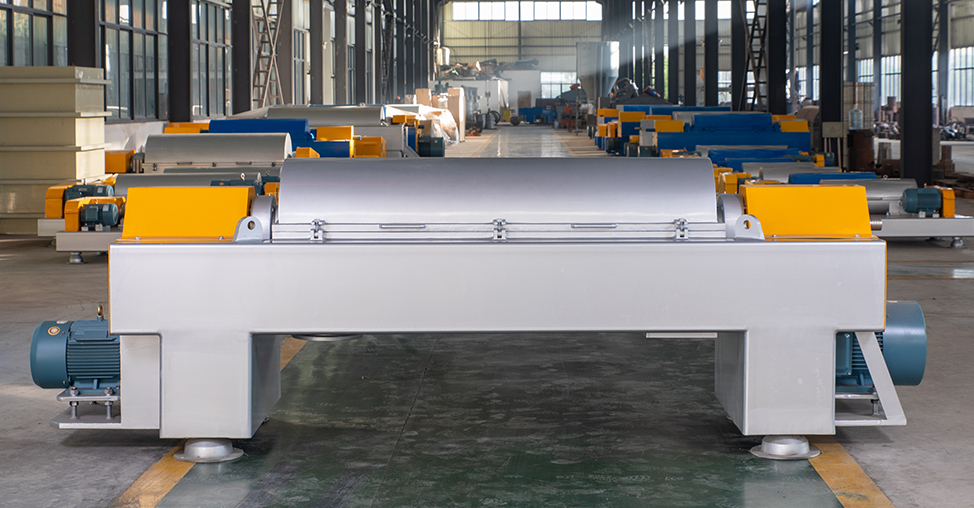當(dāng)混合液體有進(jìn)料口進(jìn)入高速旋轉(zhuǎn)的轉(zhuǎn)鼓體內(nèi)腔后,混合液體中比重較大的固性物,在離心力的作用下,迅速沉降到轉(zhuǎn)鼓內(nèi)壁,被螺旋推料器從固相出口排出轉(zhuǎn)鼓體外;同時(shí)比重較小的液相則在離心力的作用下形成內(nèi)層液環(huán),通過液相溢流口排出轉(zhuǎn)鼓體外。轉(zhuǎn)鼓與螺旋推料器同時(shí)高速運(yùn)轉(zhuǎn),由于兩者之間存在一定的轉(zhuǎn)速差,使得沉降在轉(zhuǎn)鼓壁上固性物不間斷地被螺旋推料器推送至出液口排出,整個(gè)分離過程連續(xù)進(jìn)行。