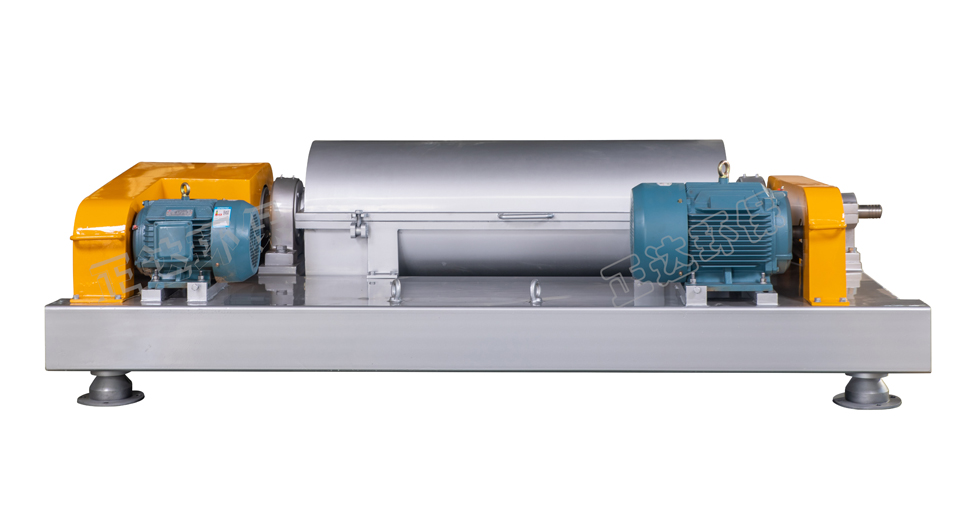 臥螺離心機,又稱為臥式螺旋卸料沉降離心機,利用高速旋轉產生的離心加速度將液體中的固體顆??焖俪两?,并沉積在轉鼓內壁。物料通過進料管被泵入腔體內部后,轉鼓和螺旋輸送機以差速同向高速旋轉,使固體沉淀在轉鼓內壁上,然后通過螺旋輸送機排出,澄清的液相則從轉鼓另一端的出液堰口排出,從而實現(xiàn)對物料的連續(xù)進料、分離和卸料的過程,最終達到固液分離的效果。
